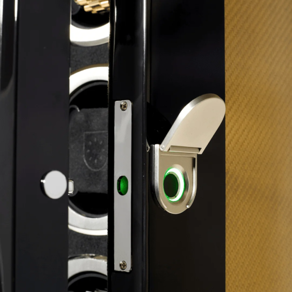 Resting above the winding section is a biometric storage compartment secured by fingerprint recognition alone. No keys to misplace. No codes to remember. Your fingerprint is the only thing standing between your collection and the rest of the world.