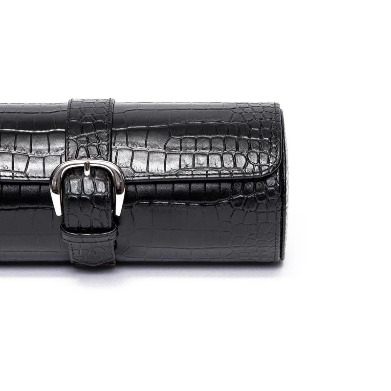 Premium crocodile-effect leather travel case. Soft suede lining protects three watches. Chrome buckle closure. 200x80mm. Five colors available.