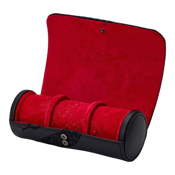 Celebrate Lunar Year with our Snake Triple Watch Roll. Bold black exterior with red-eyed dragon embroidery. Red suede interior. Holds 3 watches plus hidden treasures.